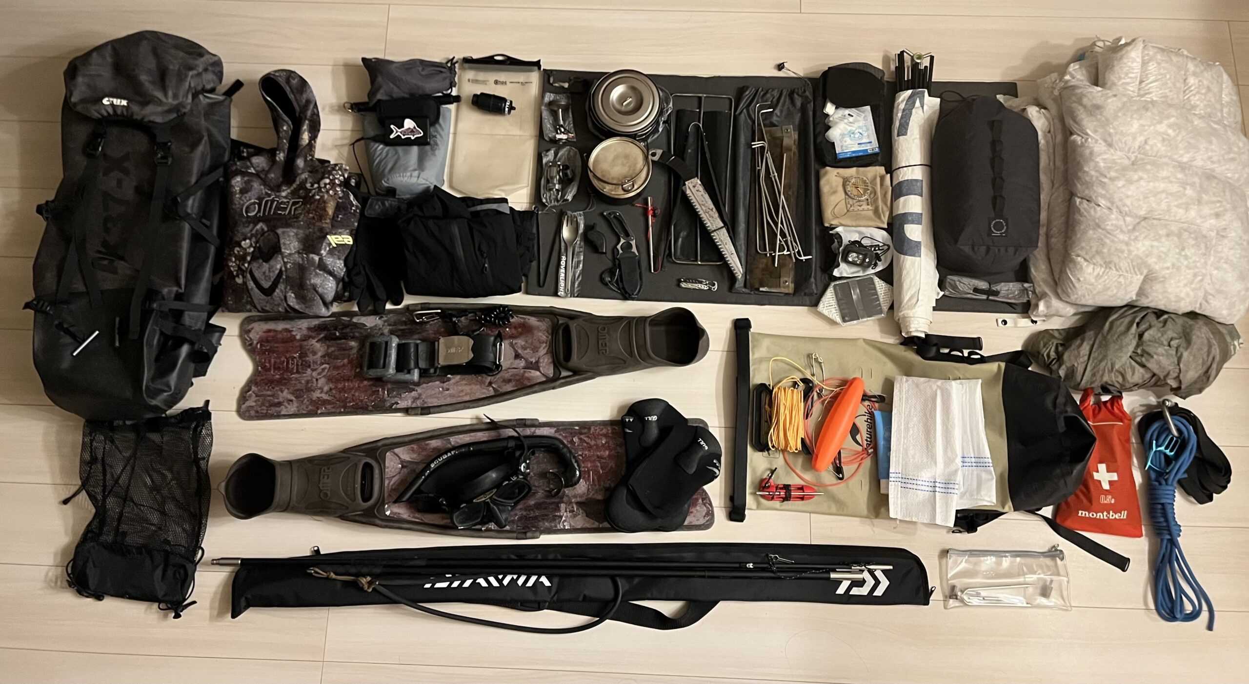 ULの登山装備は軽くなった分、他のジャンルの装備をパッキングできる。僕はタンクもBCもいらない海のULなアクティビティである「スキンダイビング」、地域によっては「スピアフィッシング」を組み合わせて島旅を行っている。